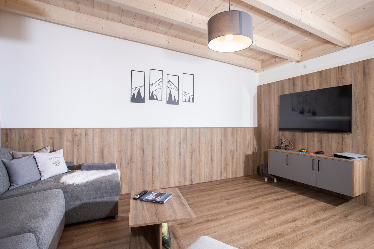 Im Wohnzimmer befinden sich eine gemütliche Couch mit Dauerschlaffunktion und ein Flatscreen.