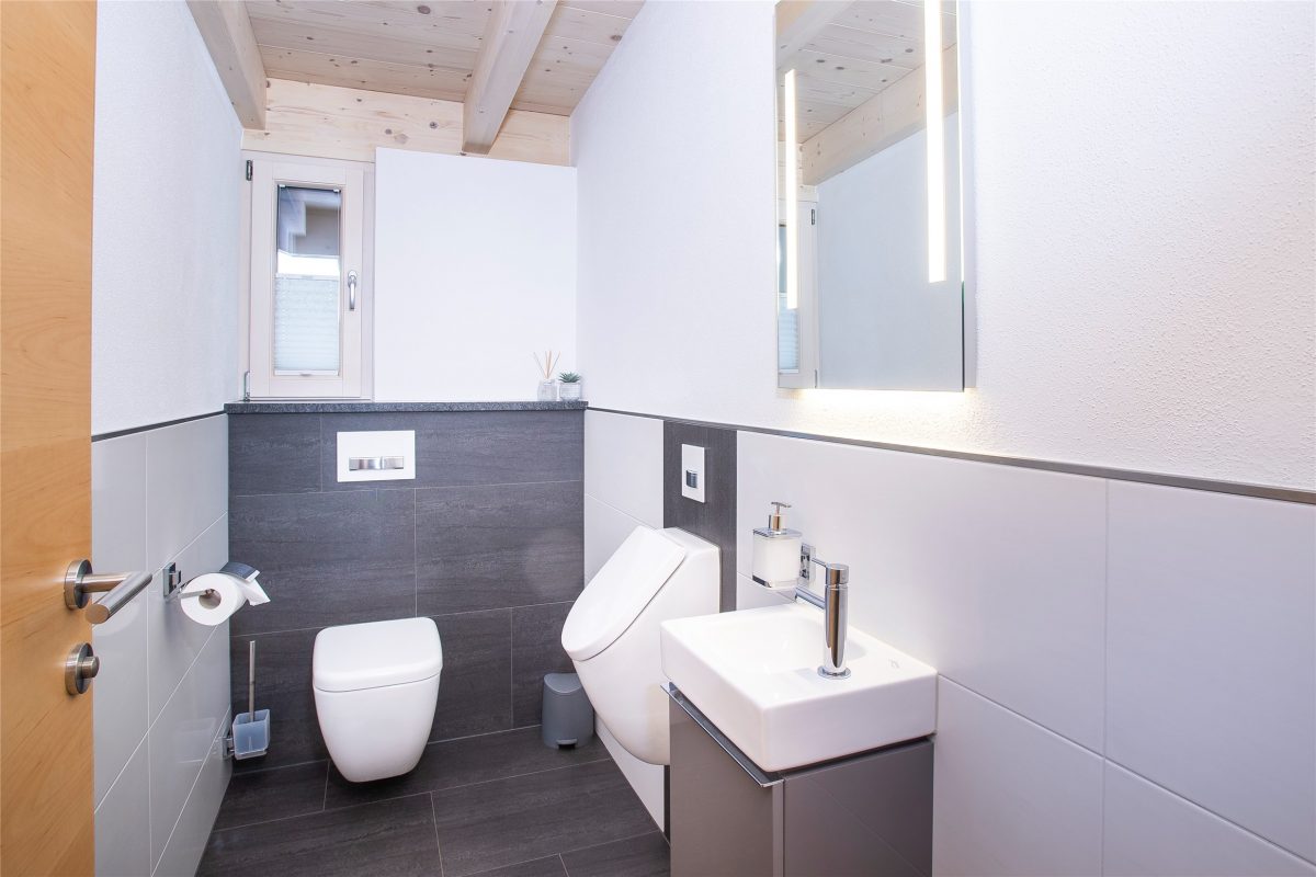 Das Badezimmer verfügt über Doppelwaschbecken, Dusche, Badewanne und WC. Ein separates WC ist ebenso vorhanden.